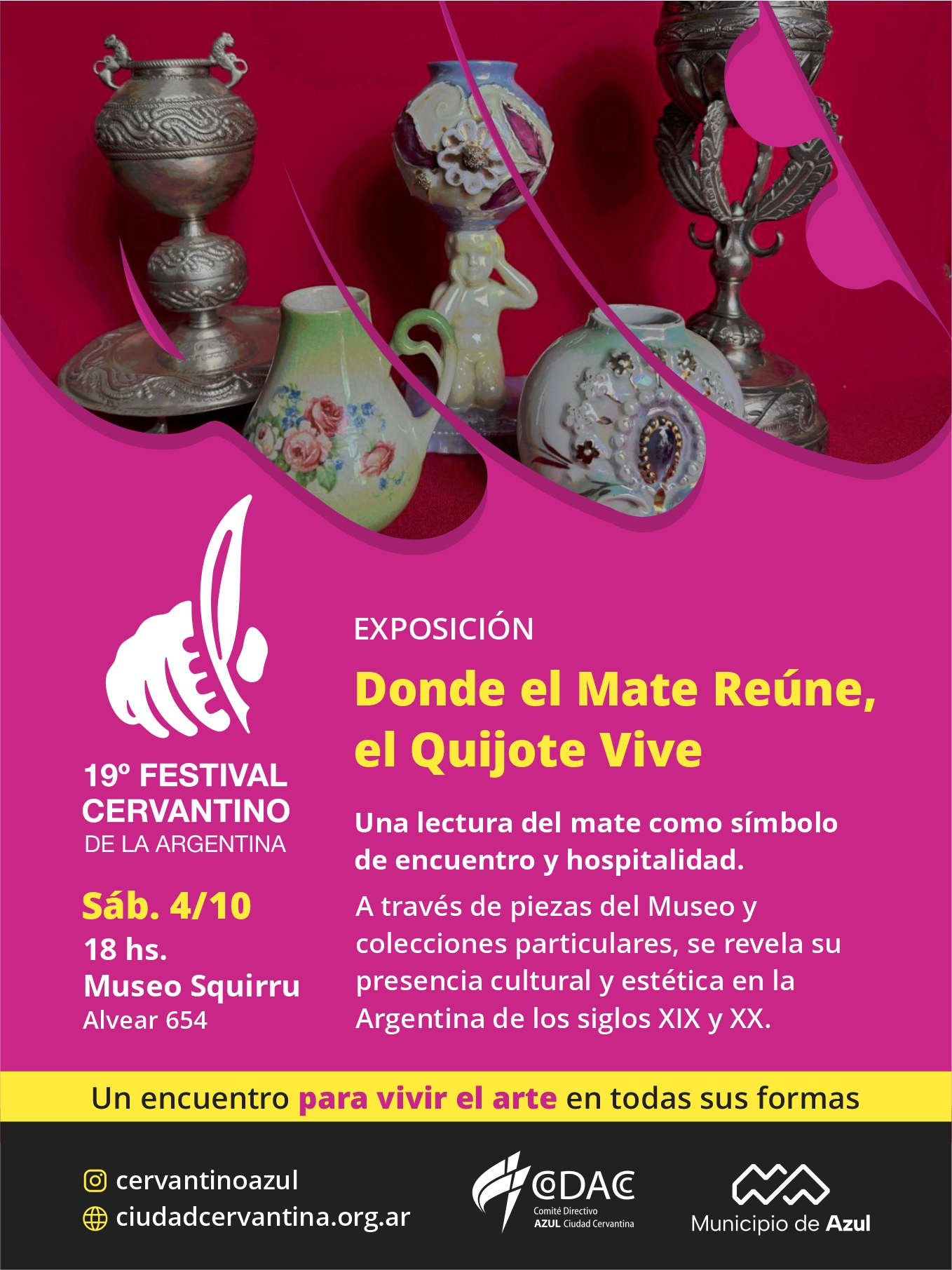 La exposición propone una lectura del mate como objeto cultural ligado a valores quijotescos como la hospitalidad y el encuentro. A través de piezas de los siglos XIX y XX, se refleja su diversidad social y estética, mostrando cómo el ritual trasciende clases y contextos. La muestra pone en valor tanto las colecciones del Museo como de particulares.
