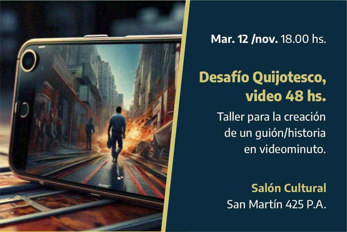 Taller donde se le aportarán las herramientas técnicas relacionadas a la creación de un guion/historia de ficción para que puedan realizar la propia. Los participantes deberán cumplir el desafío de realizar y entregar un video minuto (duración de 1min hasta 3min.), respetando la consigna que se le dará a las 00:00 hs antes de la fecha de entrega que será a las 48hs exactas.