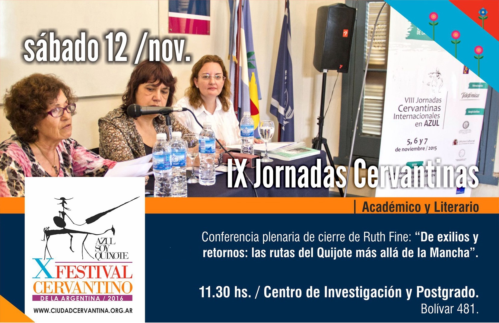 Auspician: Asociación de Cervantistas / Embajada de España en Argentina – AECID – Cooperación Española Cultura Buenos Aires / IV Centenario de la muerte de Cervantes / Facultad de Filosofía y Letras – Universidad de Buenos Aires / Facultad de Filosofía y Letras – Universidad Católica Argentina / Academia Argentina de Letras / Biblioteca Popular de Azul “Bartolomé J. Ronco”.